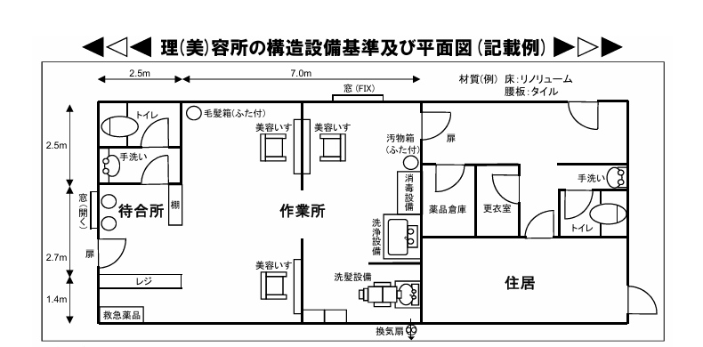 ・作業所の面積(内寸面積)は、理(美)容いす(洗髪設備は除く)2脚までは9㎡以上、1脚増すごとにプラス3㎡以上であること。(例︓5脚設置の場合、9+3×(5-2) = 18㎡以上)