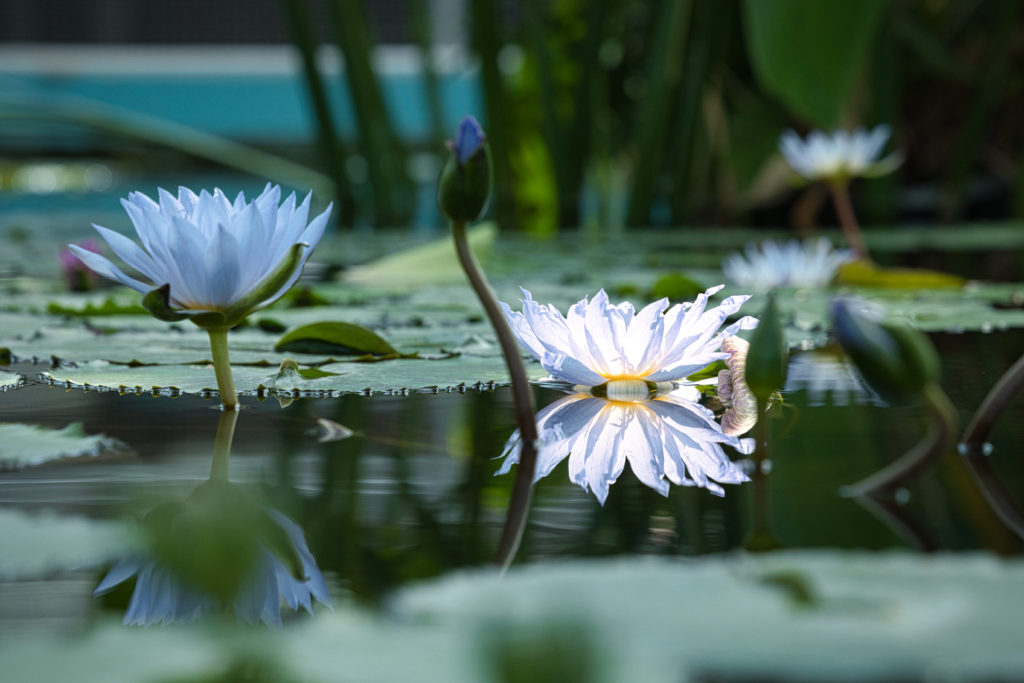 ちょうど日の光が1つの花にだけ当たって幻想的だったので、水面のリフレクションを意識して撮影した1枚となります。